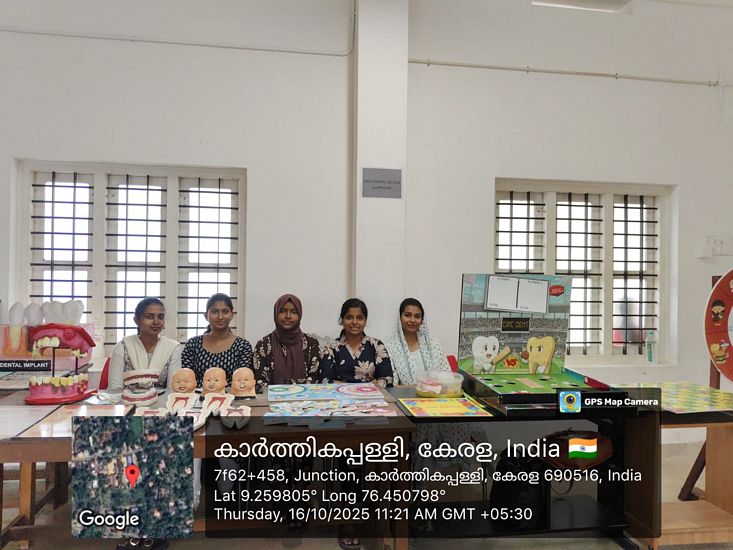 The Department of Public Health Dentistry actively participated in the exhibition organized at IHRD College, Karthikapally, Haripad, as part of Nexora 2025 National Techno Fest & Cultural Fest, held on 16–18 October 2025. Senior residents and house surgeons from the department represented Public Health Dentistry throughout the three-day event, showcasing informative displays and engaging with students, faculty, and visitors to promote awareness of oral health, preventive dentistry, and community-based dental care. Their participation reinforced the department’s commitment to health education, community outreach, and the dissemination of public health initiatives.